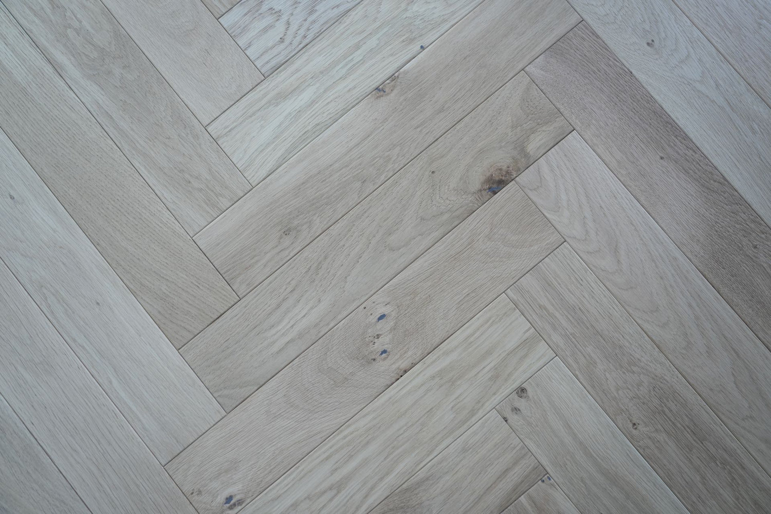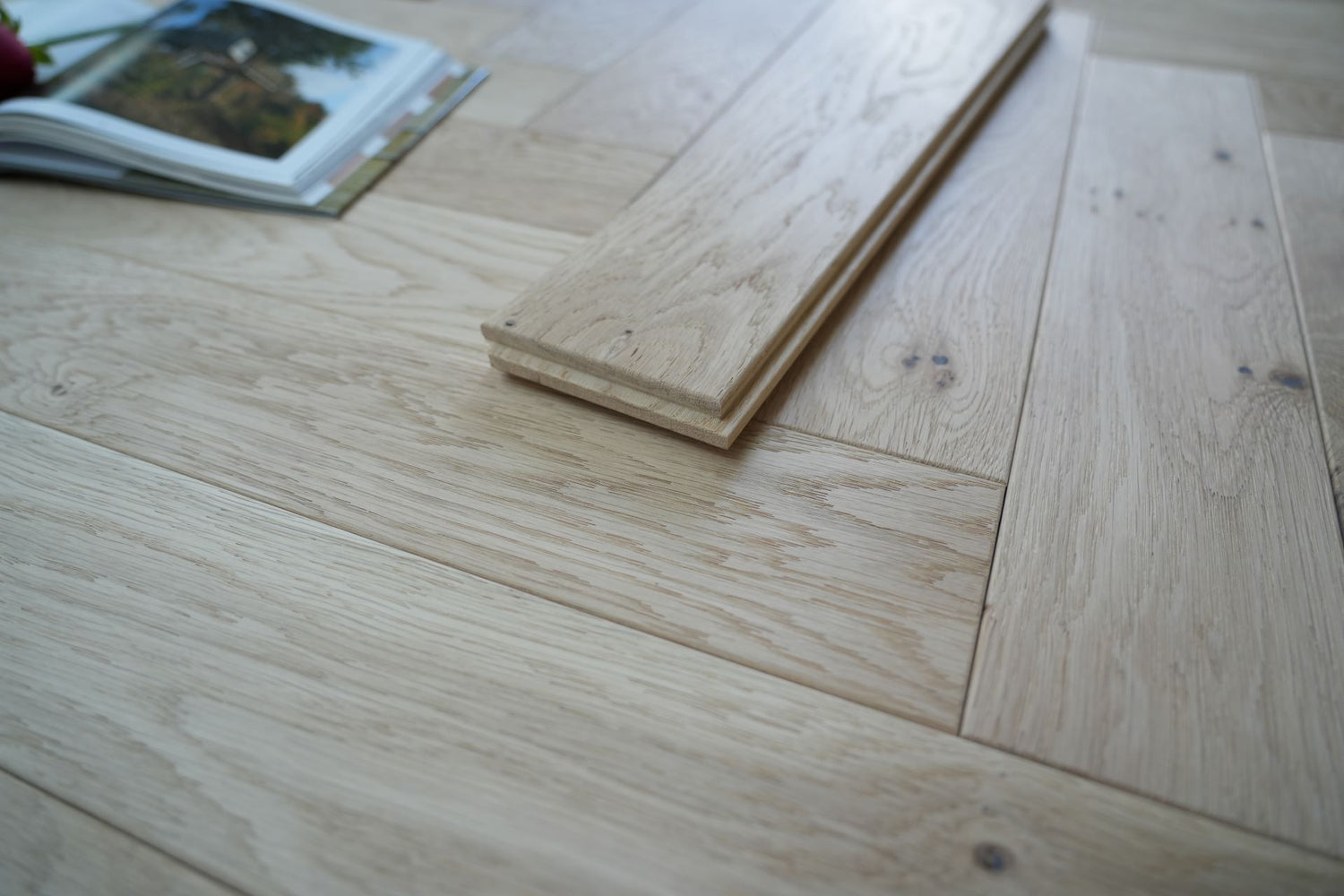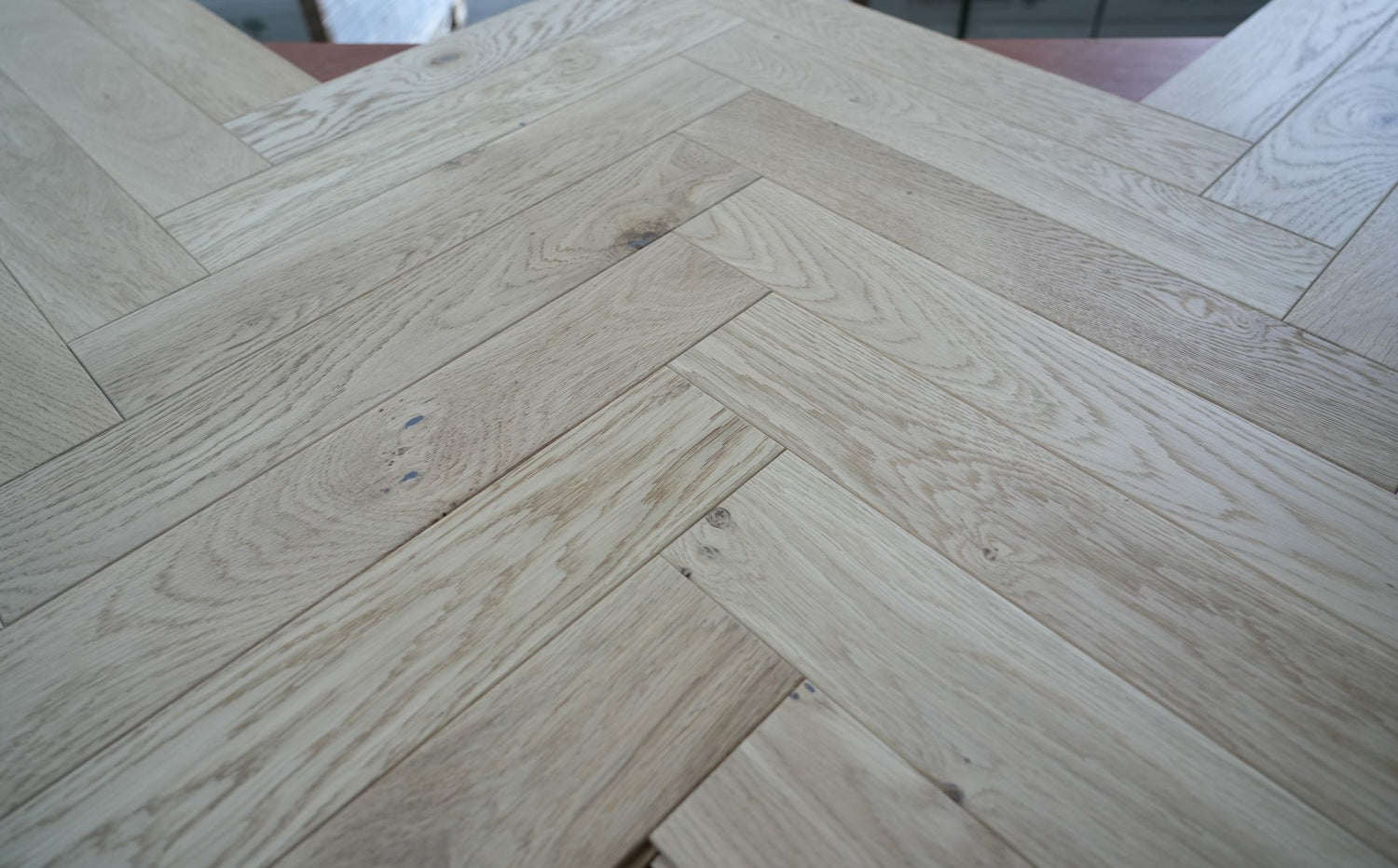 Et naturligt, flot og ubehandlet sildebensparket i massiv eg, som du kan sætte dit eget præg på.